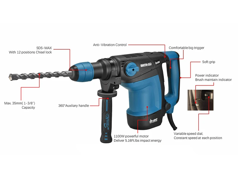 ● تصميم منخفض الاهتزاز والضوضاء مع طاقة عالية التأثير.