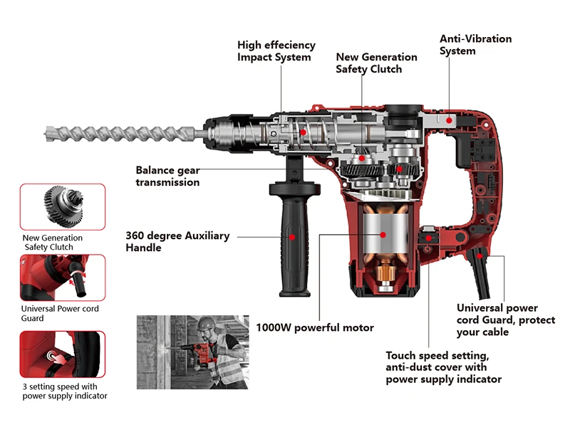● زاوية الإزميل قابلة للتعديل من خلال قفل مكون من 12 خطوة؛ مما يتيح لك تكييفها مع كل موقف عمل. (على سبيل المثال عند استخدام إزميل البلاط)